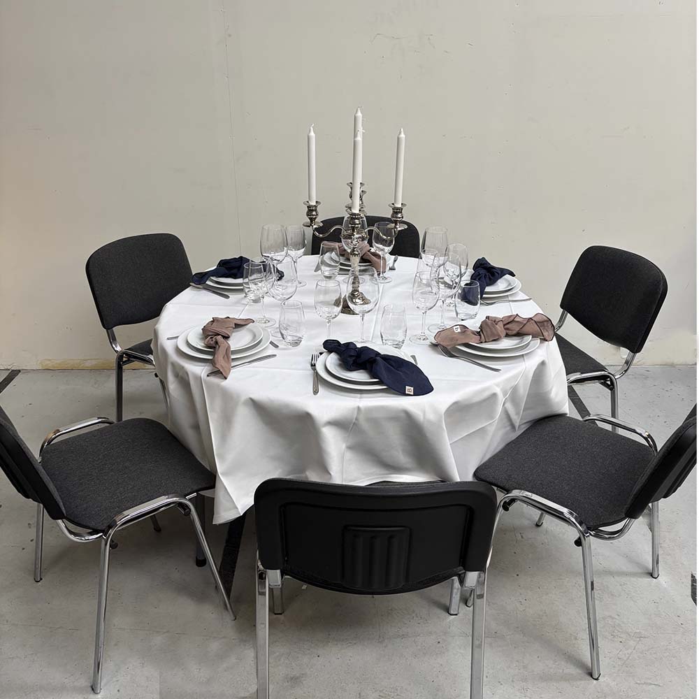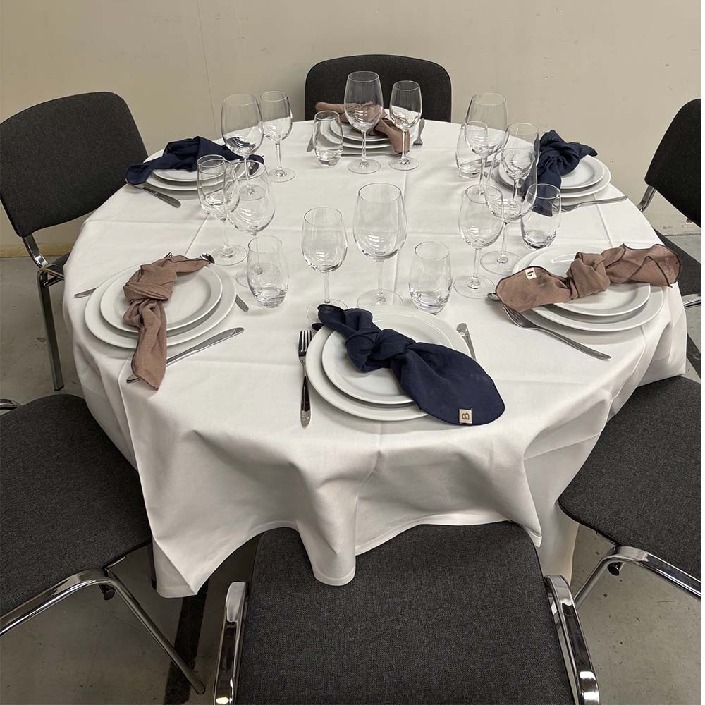 Rundt bord til 6 personer. Dug: kvadratisk dug 180×180. Bordet skal tørres af efter brug.